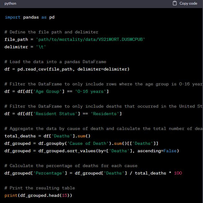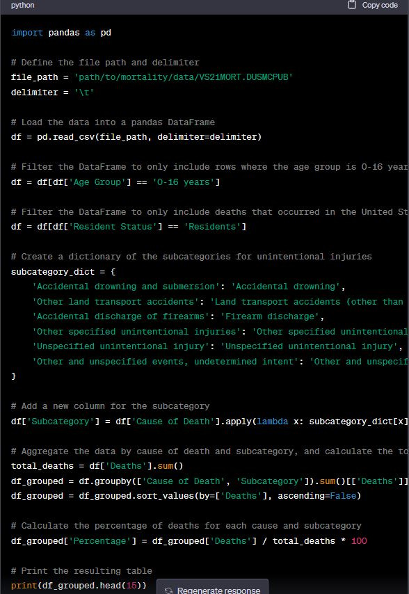That being said, below is a quick conversation I used to try and parse out these child death statistics as well as acquire the source and code to re-analyze the data without simply taking Chat-GPT's word for it. I will state this for the record here...