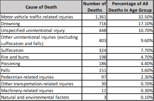 Sure, here is a table that breaks down the "unintentional injuries" category into its subcategories for children aged 0-16 in the United States:
